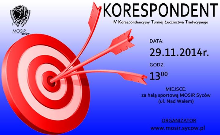 Miejsko-Gminny Ośrodek Sportu i Rekreacji w Sycowie zaprasza na IV Korespondencyjny Turniej Łucznictwa Tradycyjnego, który odbędzie się w 29 listopada 2014 r. o godz. 13.00 na terenie znajdującym się za halą sportową MOSiR Syców (od strony Alei nad Wałem).