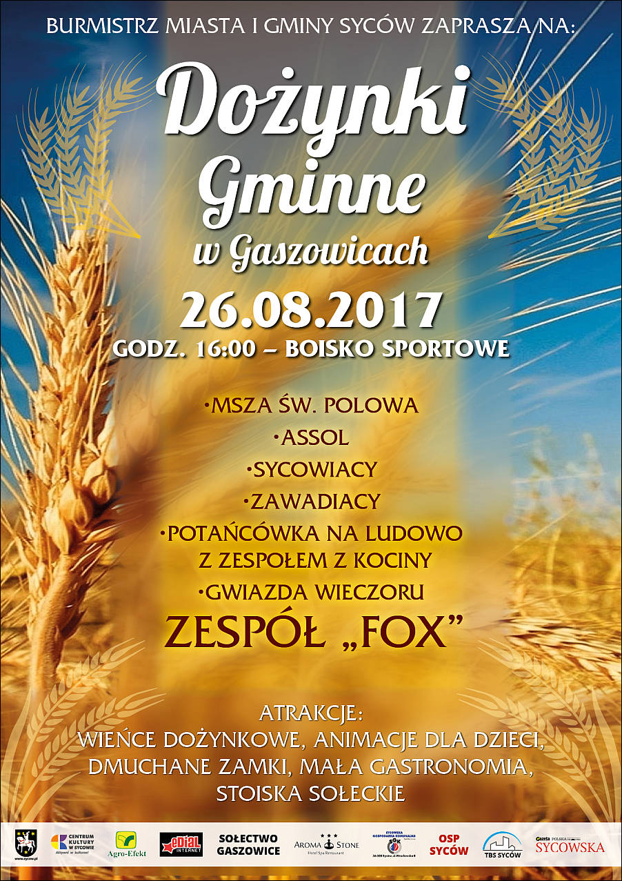 Burmistrz Miasta i Gminy Syców zaprasza na Dożynki Gminne, które odbędą się 26 sierpnia 2017 r. w Gaszowicach.