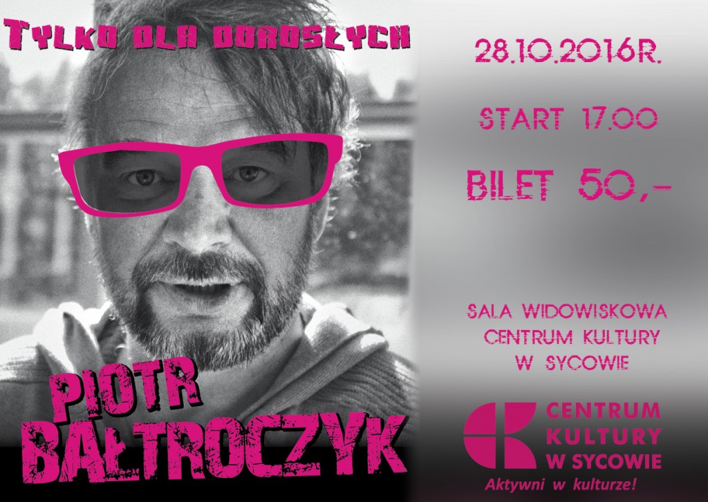 Zapraszamy na najnowszy program kabaretowy w wykonaniu Piotra Bałtroczyka pt. „Tylko dla dorosłych”, który artysta przedstawi 28 października 2016 r. w sycowskiej sali widowiskowej Centrum Kultury. Początek o godzinie 17:00. Bilety: cena 50 zł.