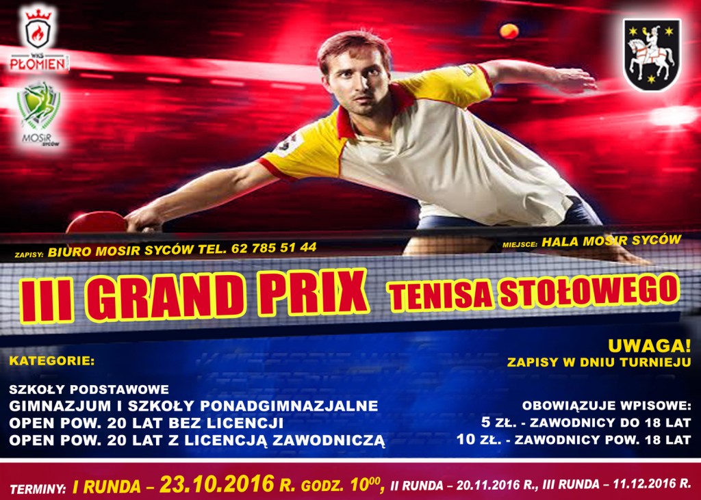 Zapraszamy sympatyków tenisa stołowego do udziału w III GRAND PRIX Tenisa Stołowego - Syców 2016. Jest to trzecia edycja tej cieszącej się dużym zainteresowaniem imprezy, organizowana przez sycowski MOSiR. Sycowskie GRAND PRIX to zawody składające się z trzech turniejów organizowanych kolejno w miesiącach: październiku, listopadzie i grudniu. I runda GRAND PRIX Tenisa Stołowego – Syców 2016 odbędzie się już 23.10.2016 r. godz. 10.00. Szczegółowe informacje w biurze MOSiR Syców tel. (62) 785 51 44.