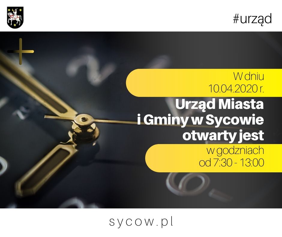 W dniu 10.04.2020 Urząd Miasta i Gminy w Sycowie będzie czynne w godzinach od 7:30 do 13:00.