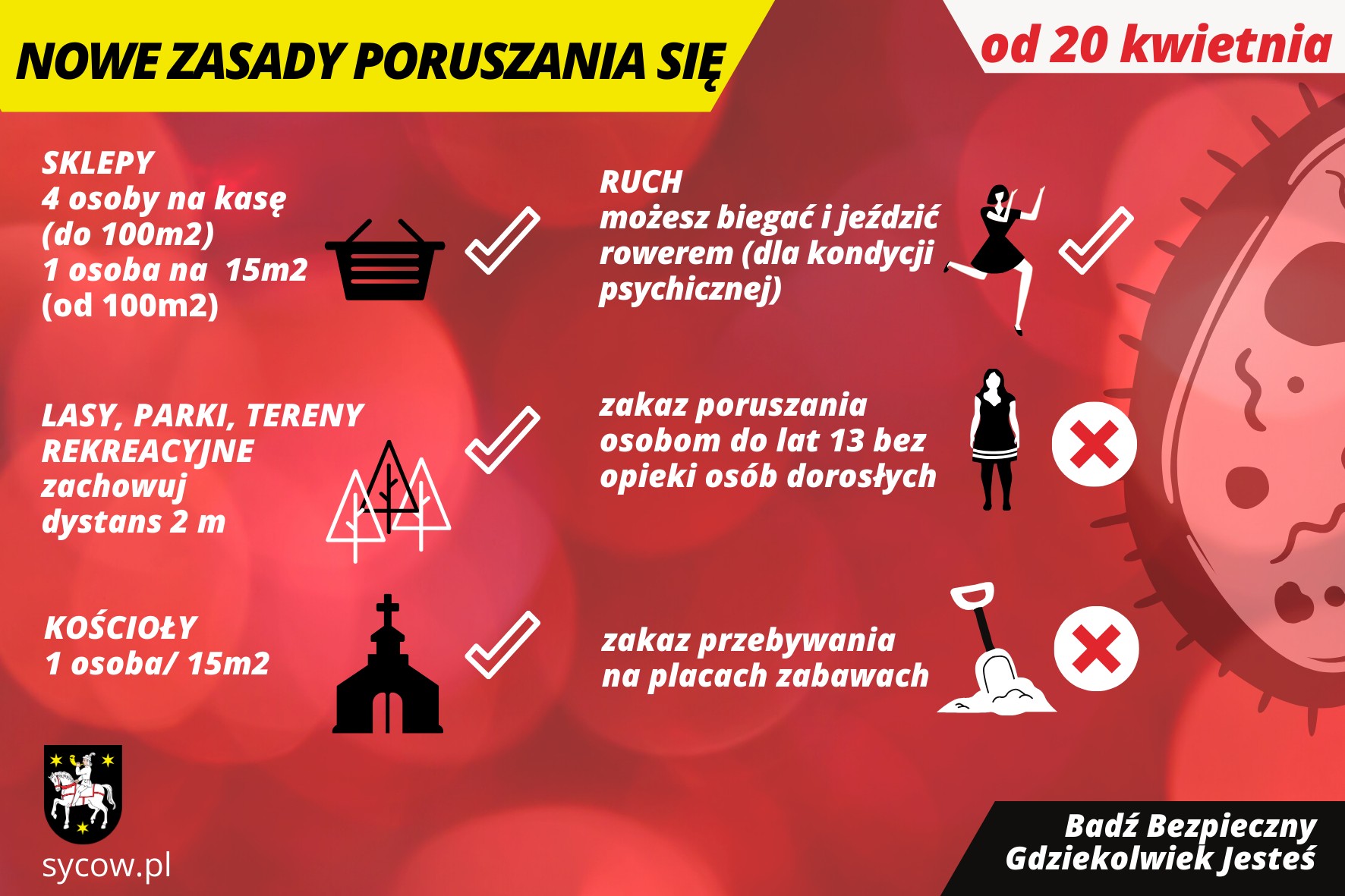 Od 20 kwietnia zostaje zniesione część ograniczeń w poruszaniu się w przestrzeni publicznej. Szczegóły na grafice.