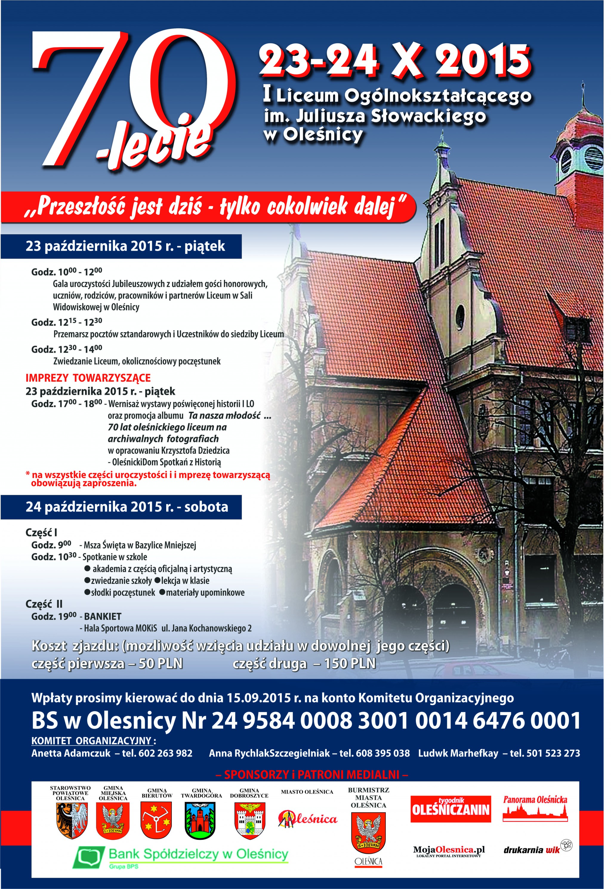 Na prośbę Dyrekcji I Liceum Ogólnokształcącego im. Juliusza Słowackiego w Oleśnicy zawiadamiamy, że 24 października 2015 r. odbędzie się VII Jubileuszowy Zjazd Absolwentów Liceum z lat 1947-2015 z okazji 70-lecia szkoły.
