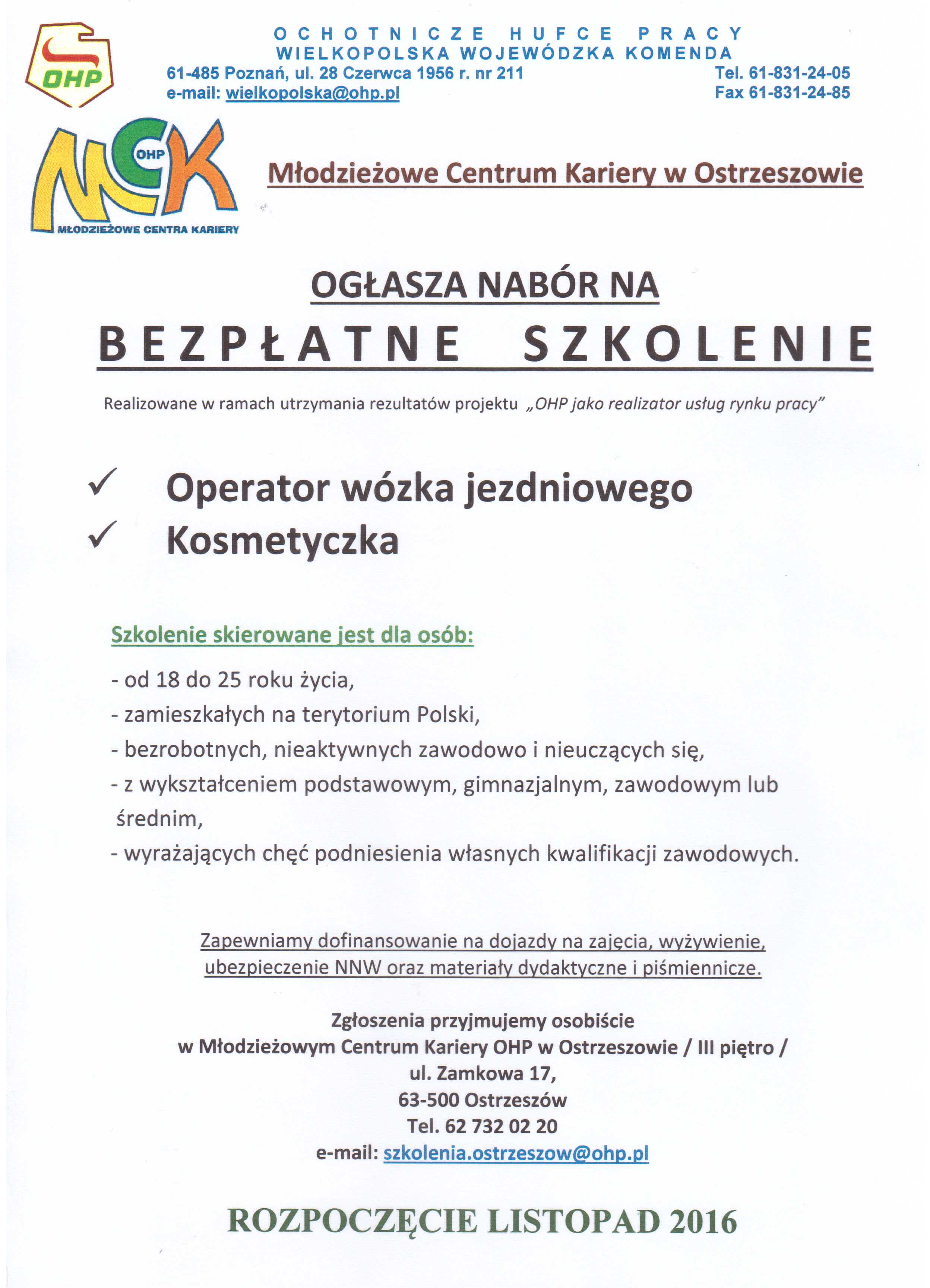 Młodzieżowe Centrum Kariery w Ostrzeszowie ogłasza nabór na bezpłatne szkolenie realizowane w ramach utrzymania rezultatów projektu „OHP jako realizator usług rynku pracy” w zawodzie Operator wózka jezdniowego oraz Kosmetyczka. Rozpoczęcie szkolenia: listopad 2016 r.