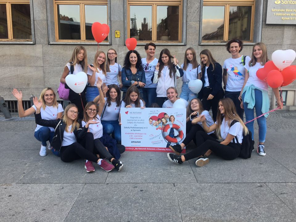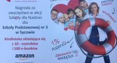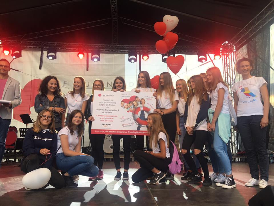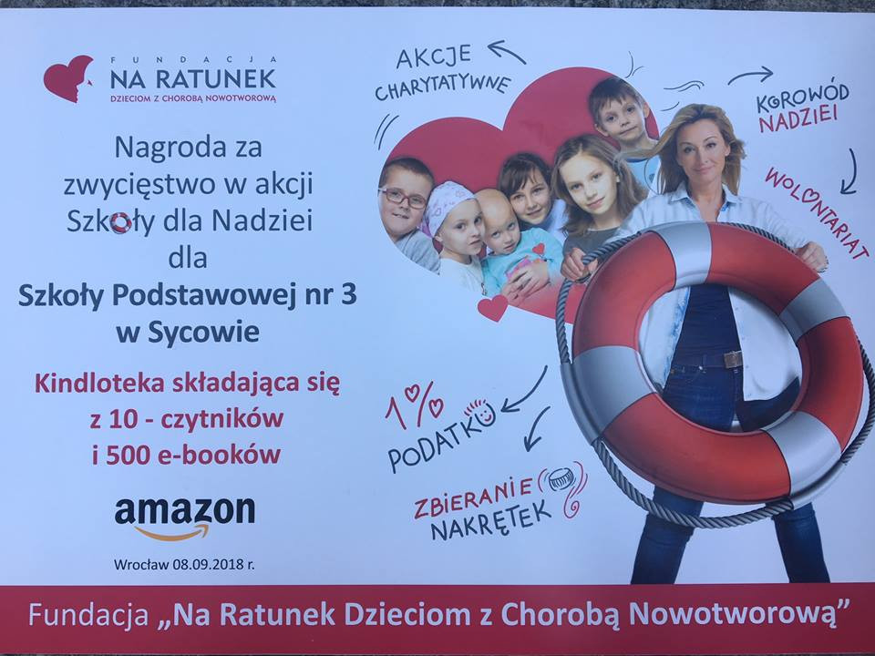 Ponad 100 szkół z terenu Dolnego Śląska wzięło udział w akcji charytatywnej Szkoły dla Nadziei... Wśród nich najlepsza to Szkoła Podstawowa nr 3 z Sycowa! Przez cały rok szkolny dzięki ogromnemu zaangażowaniu uczniów, nauczycieli i rodziców szkoła wspierała dzielnych małych pacjentów Kliniki Onkologii i Hematologii Dziecięcej. 8 września na wrocławskim Rynku szkoła odebrała główną nagrodę: nowoczesną Kindlotekę - bibliotekę wyposażoną w 10 czytników i 500 e-booków ufundowaną przez firmę Amazon. Bez wątpienia będzie to teraz „zaczytana trójka”. Gratulujemy!