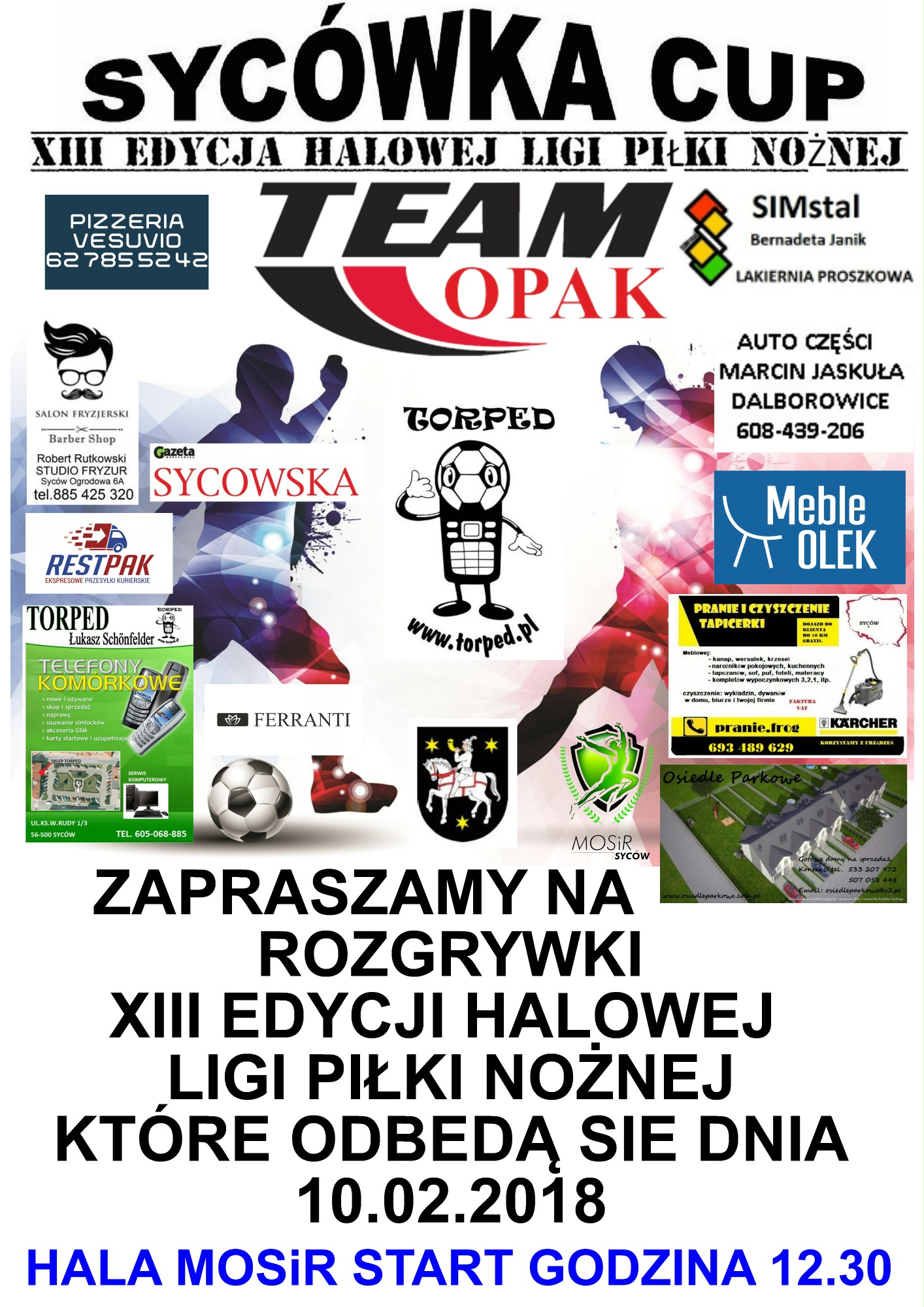 Zapraszamy do udziału w kolejnej rundzie XIII edycji Halowej Ligi Piłki Nożnej "Sycówka Cup". Turniej odbędzie się w hali MOSiR-u 10 lutego. Początek o godz. 12.30. Atrakcyjne nagrody czekają na zwycięzców. Zachęcamy do udziału!