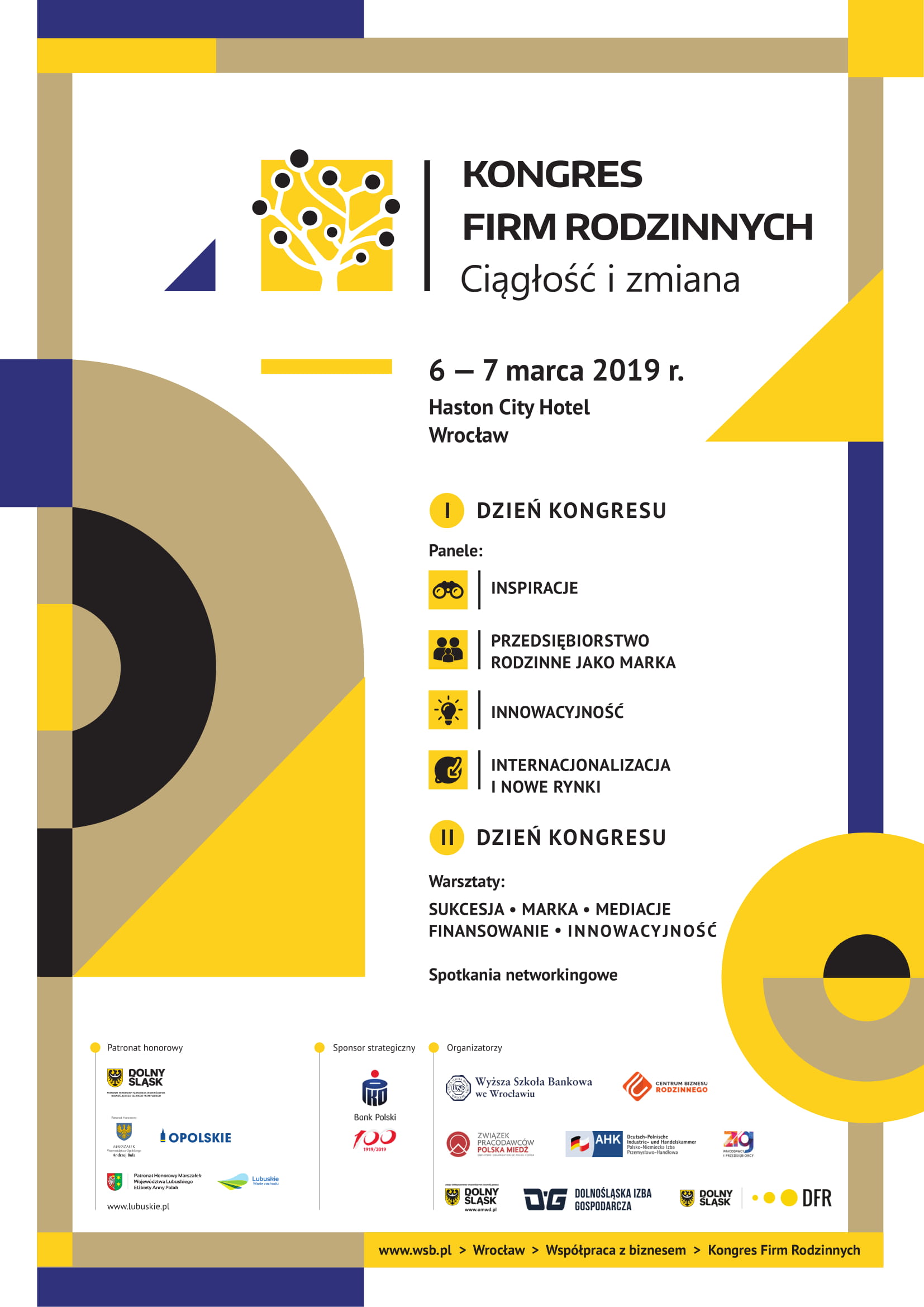 Organizatorami Kongresu Firm Rodzinnych „Ciągłość i zmiana” są Centrum Biznesu Rodzinnego Wyższej Szkoły Bankowej we Wrocławiu, Urząd Marszałkowski Województwa Dolnośląskiego, Zachodnia Izba Gospodarcza – Pracodawcy i Przedsiębiorcy, Dolnośląska Izba Gospodarcza, Regionalna Polsko-Niemiecka Izba Przemysłowo-Handlowa, Związek Pracodawców Polska Miedź, Dolnośląski Fundusz Rozwoju.