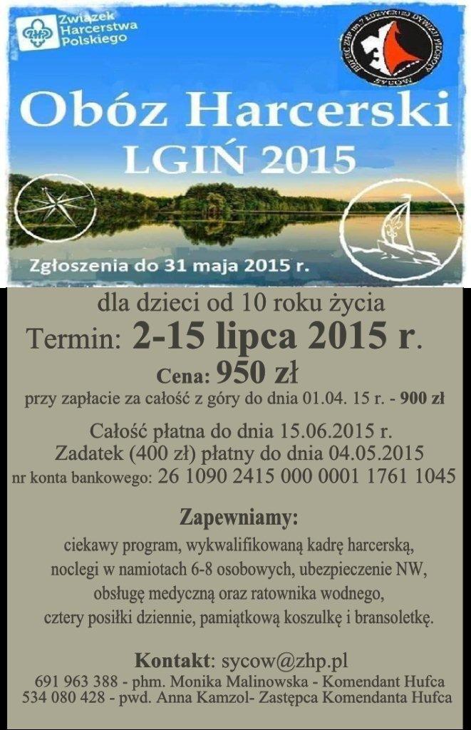Związek Harcerstwa Polskiego - Hufiec w Sycowie proponuje sposób na wakacyjny wypoczynek dla dzieci. Obóz pod namiotami - Lgiń 2015 zorganizowany zostanie w terminie 2-15 lipca br. Zgłoszenia przyjmowane będą do 31 maja. Szczegółowe informacje zawarte są na plakacie. Organizatorzy zapewniają bezpieczną, ciekawą formę spędzania czasu wolnego dla dzieci i młodzieży.